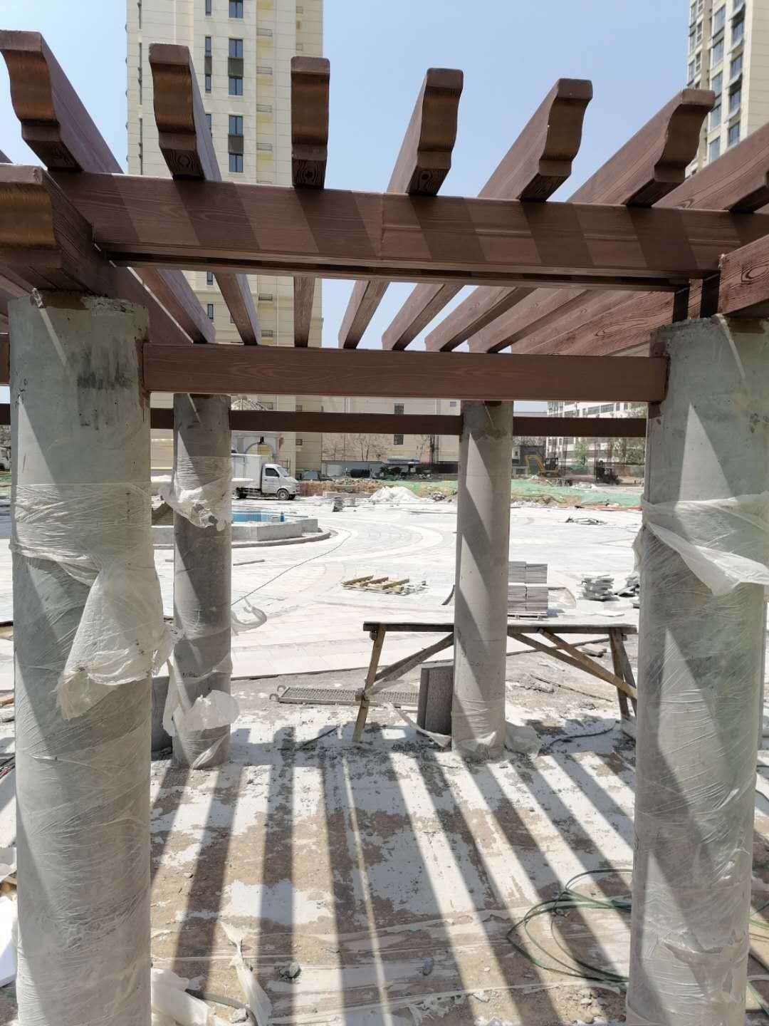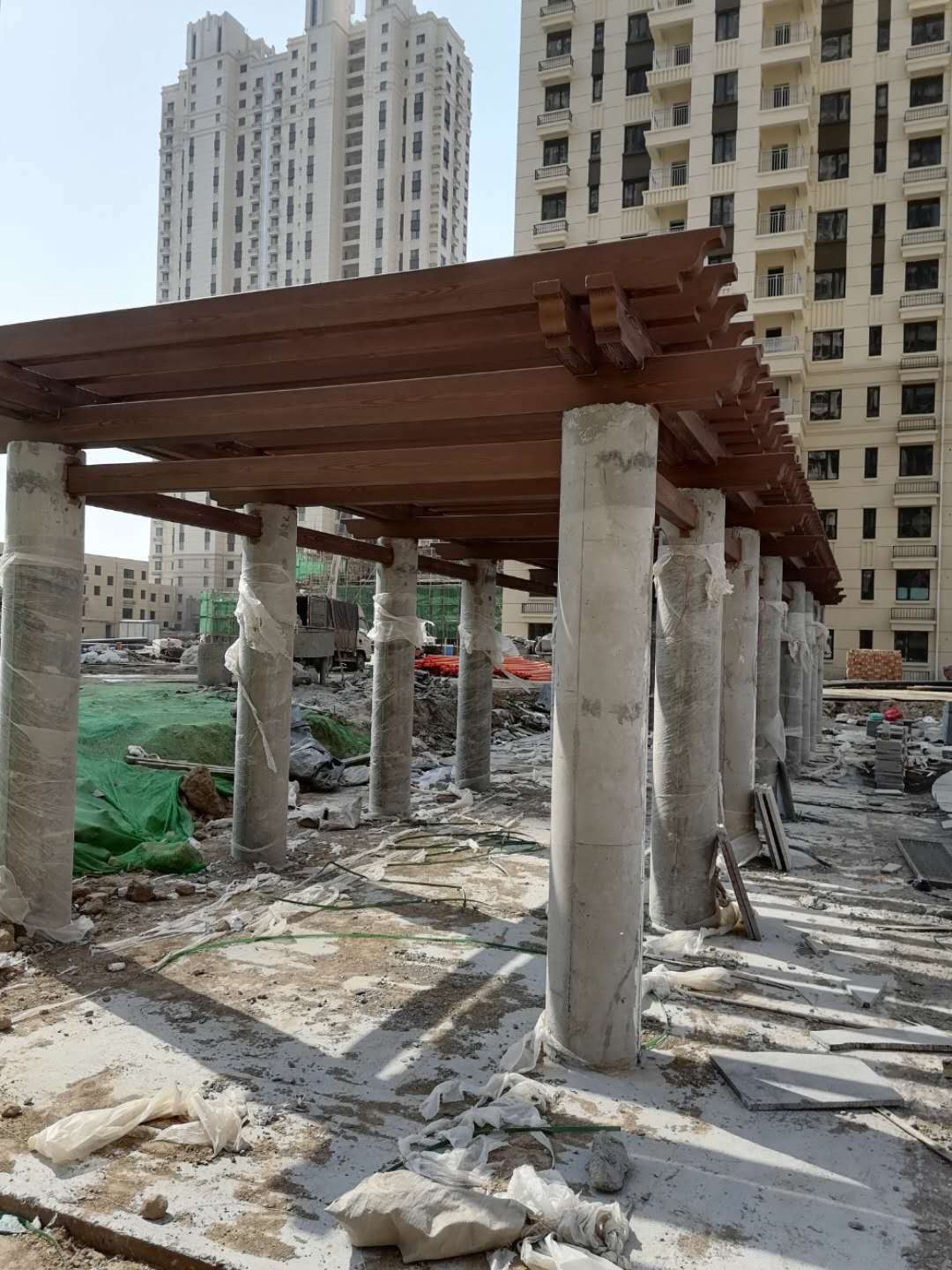 山東德州金球華地廣場樓盤下集聚多棟樓宇與大量商鋪,其中樓區(qū)綠化中選擇的護欄搭建及休息區(qū)廊亭的裝飾材料,都是環(huán)保水性木紋漆,耐用又美觀,廊架焊接好以后涂刷上木紋漆,與實木的逼真效果高達99.9%。
