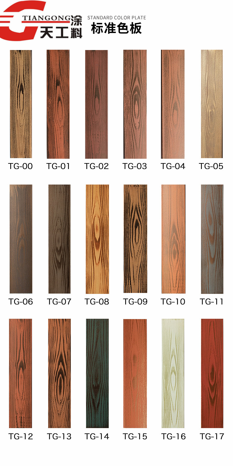 木紋漆是目前仿實(shí)木效果最火爆的藝術(shù)漆,在很多商場(chǎng)車庫(kù)出入口,護(hù)欄鋼構(gòu),門窗,廊架涼亭、扶梯欄桿都可以看到木紋漆的身影,天工木紋漆顏色多樣,紋路隨機(jī),可隨機(jī)調(diào)色也可以來(lái)樣定制,相對(duì)實(shí)木來(lái)說(shuō)木紋漆既環(huán)保又節(jié)約成本。室內(nèi)外做木紋漆施工安全無(wú)害。那么說(shuō)了木紋漆這么多的好處到底木紋漆有哪些顏色呢?