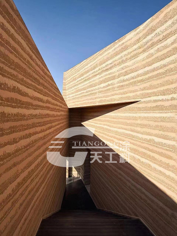 仿夯土泥巴墻并不是真正意義上的夯土墻,它是一層干粉砂漿,覆蓋在現(xiàn)有鋼筋混凝土結(jié)構(gòu)的基礎(chǔ)上,它是現(xiàn)場批刮成型的,它有多種顏色和層次感,因?yàn)樗梢灾苯佑糜诨炷恋谋砻?,所以可以大?guī)模使用,再加上現(xiàn)代夯土施工技術(shù),可以使墻面非常光滑,沒有沙子和土壤,人們不僅獲得了夯土墻的美,而且避免了傳統(tǒng)夯土墻的各種缺陷,仿夯土涂料廣泛應(yīng)用于室內(nèi)外仿夯土建筑。